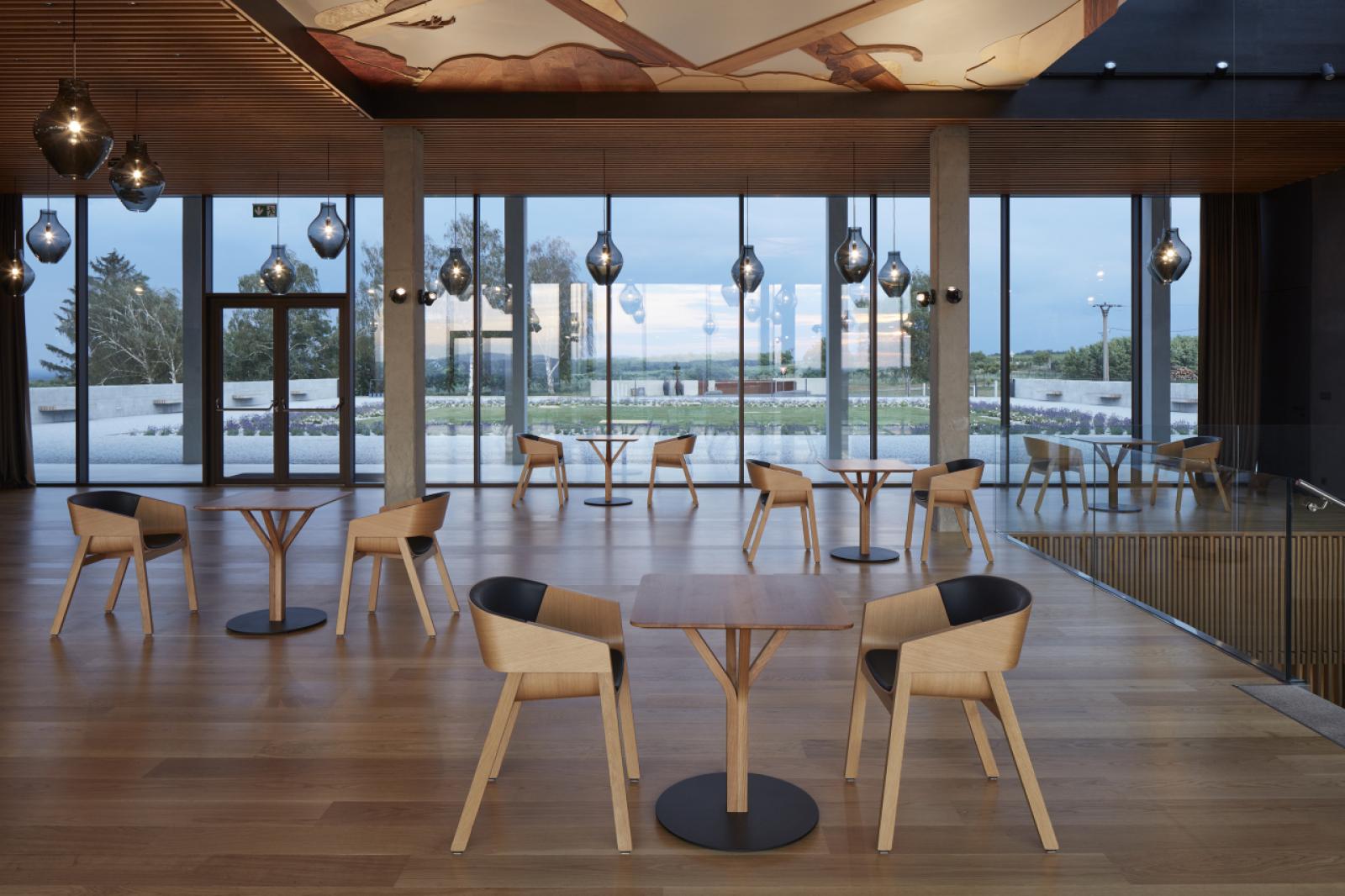 Większa część obiektu jest zanurzona w ziemi, pierwsze skrzypce gra zachwycający widok na winnice z górnego, przeszklonego piętra pawilonu. To właśnie tam będziesz rozkoszować się miejscowym winem/panoramą. Oprócz kamienia i drewna dębowego zastosowano tu czyste materiały, takie jak szkło, stal, beton czy korten. Starzeją się naturalnie wraz z otoczeniem. Spektakularnego efektu dopełniają wysokie sufity, mimo to wnętrze jest przytulne, a to dzięki kolorystyce od beżu po brąz, drewnianej podłodze oraz drewnianej inkrustacji na suficie autorstwa Natalii Perkof, która ma przywodzić na myśl barokowe sufity w valtickim pałacu. Poza standardowymi godzinami otwarcia można wziąć udział w różnych imprezach, jak np. Brunch na Obelisku, Otwarte Wielkanocne Piwnice czy Międzynarodowy Dzień Rieslinga.