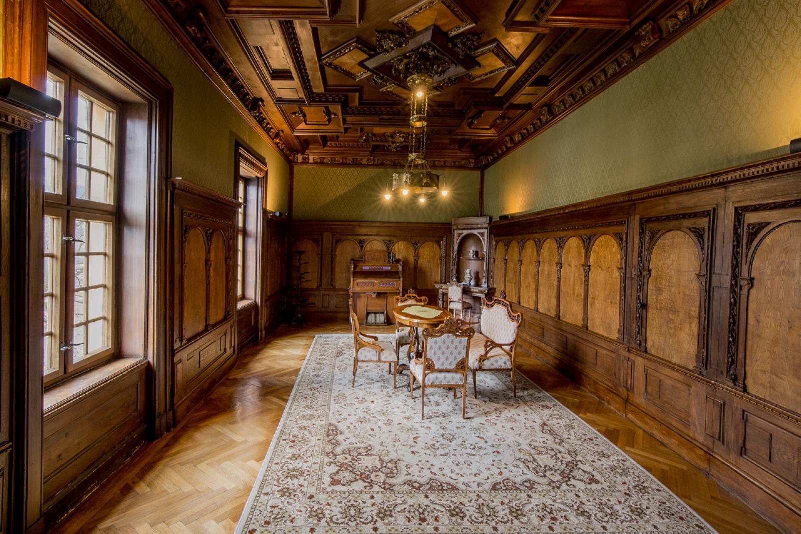 Podobnie jak w przypadku rezydencji w Rájcu, Salmowie wyposażyli w kasetowe stropy i drewniane okładziny, miejscami uzupełnione o tapety tekstylne, również niektóre pomieszczenia na pierwszym piętrze pałacu w Blansku. Do dzisiejszych czasów zachowała się drewniana boazeria w Niebieskim salonie, Zielonym gabinecie, Czerwonym saloniku, Salonie muzycznym i Różowym saloniku, które dostępne są w ramach zwiedzania wnętrz pałacu.